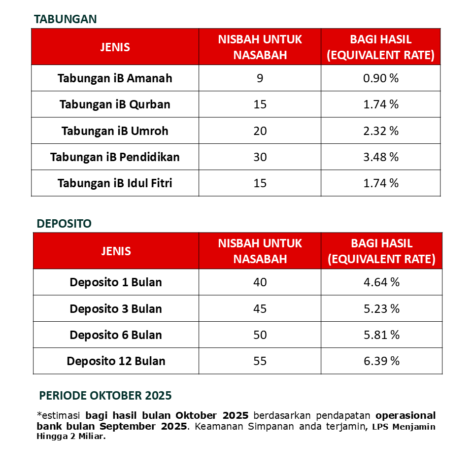 Simpanan yang sesuai dengan segala kebutuhan Anda, dijamin oleh LPS (Lembaga Penjamin Simpanan) dan menggunakan prinsip syari’ah.