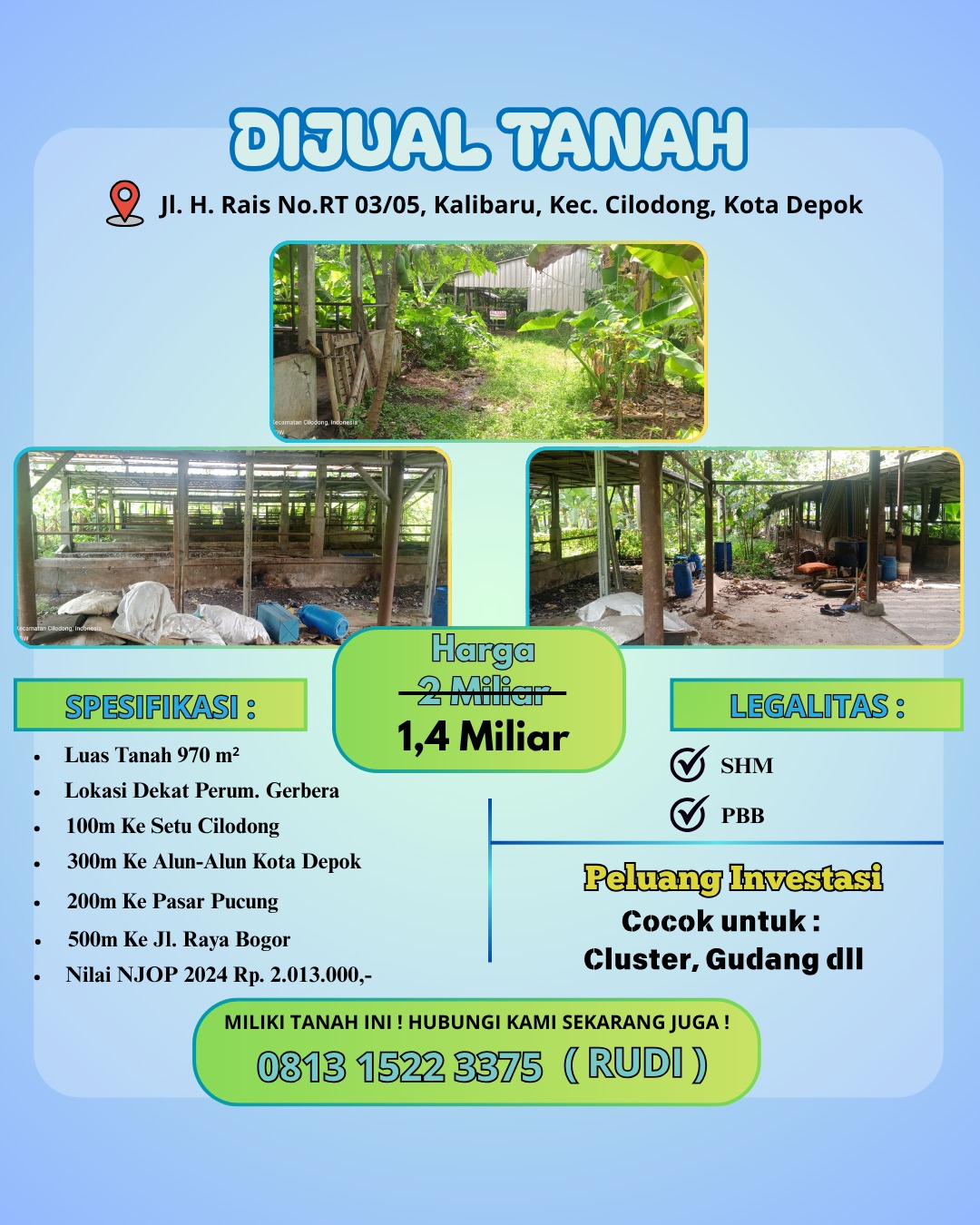 Tanah luas di Kalibaru, Cilodong Depok dengan lokasi sangat strategis dekat pusat kota. Cocok untuk investasi, cluster, gudang, atau usaha lainnya.